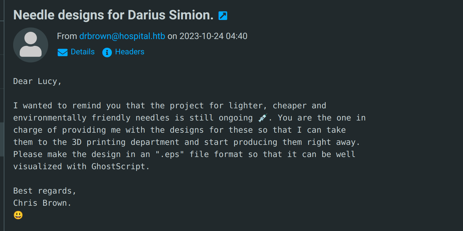 Hospital is a medium-difficulty Windows machine that hosts an Active Directory environment, a web server, and a RoundCube instance. The web application has a file upload vulnerability that allows the execution of arbitrary PHP code, leading to a reverse shell on the Linux virtual machine hosting the service. Enumerating the system reveals an outdated Linux kernel that can be exploited to gain root privileges, via [CVE-2023-35001](https://nvd.nist.gov/vuln/detail/CVE-2023-35001). Privileged access allows /etc/shadow hashes to be read and subsequently cracked, yielding credentials for the RoundCube instance. Emails on the service hint towards the use of GhostScript, which opens up the target to exploitation via [CVE-2023-36664](https://nvd.nist.gov/vuln/detail/CVE-2023-36664), a vulnerability exploited by crafting a malicious Embedded PostScript (EPS) file to achieve remote code execution on the Windows host. System access is then obtained by either of two ways: using a keylogger to capture administrator credentials, or by abusing misconfigured XAMPP permissions.