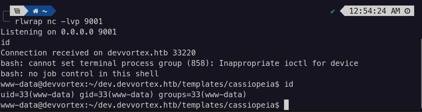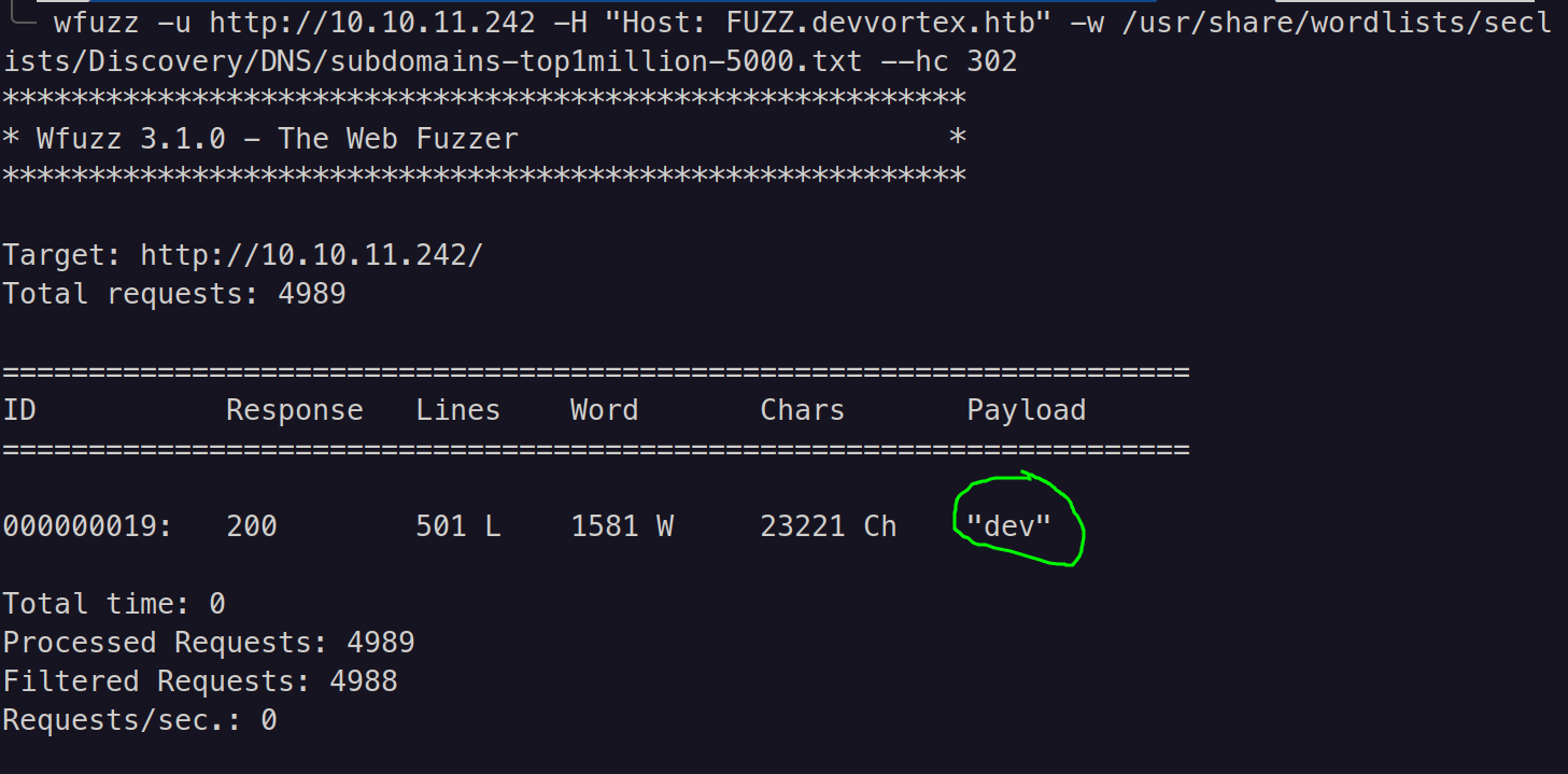 Gobuster failed to find any useful directories or files. So, I tried to find any hidden subdomain and found one using wfuzz (dev.devvortex.htb)