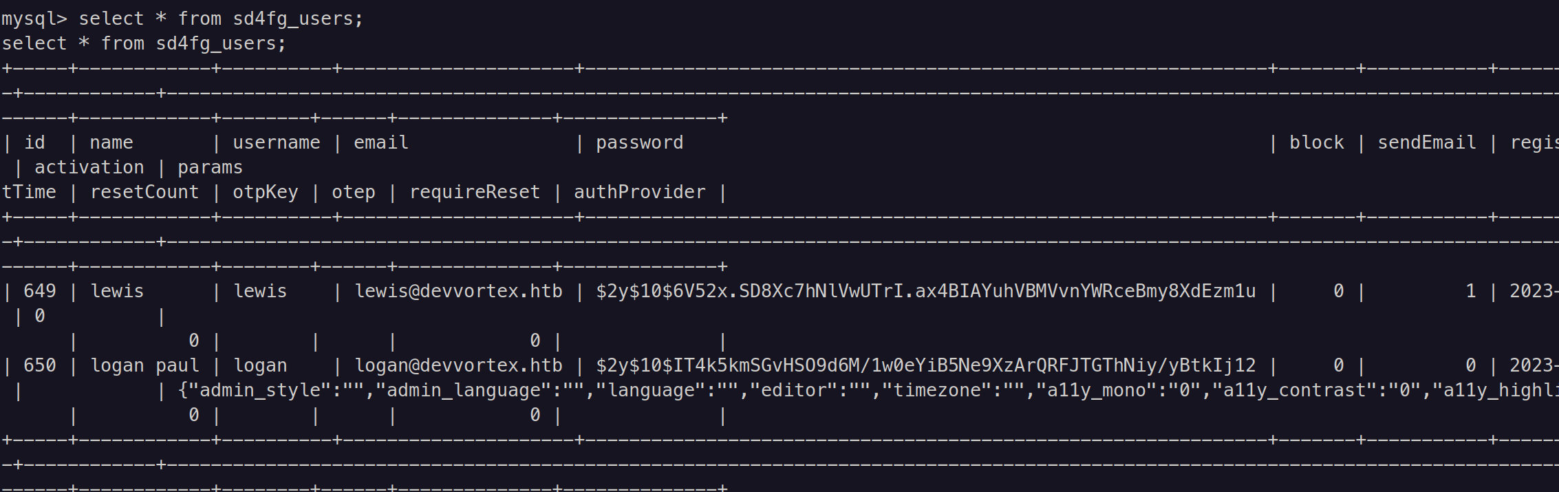 | 650 | logan paul | logan | [email protected] | $2y$10$IT4k5kmSGvHSO9d6M/1w0eYiB5Ne9XzArQRFJTGThNiy/yBtkIj12 | 0 | 0 | 2023-09-26 19:15:42 | NULL | | {"admin_style":"","admin_language":"","language":"","editor":"","timezone":"","a11y_mono":"0","a11y_contrast":"0","a11y_highlight":"0","a11y_font":"0"} | NULL | 0 | | | 0 | |