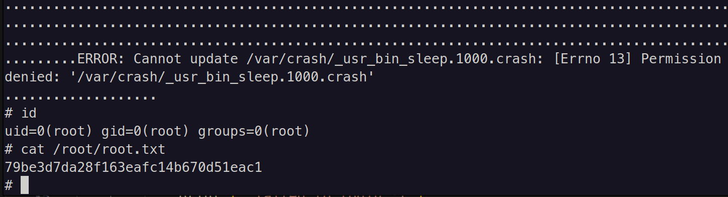 Then I again tried to exploit the apport-cli. This time it was successful and I got the root flag 79be3d7da28f163eafc14b670d51eac1